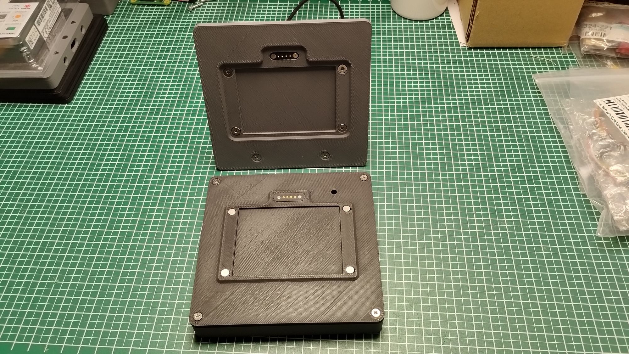 Auf der Rückseite des OBP40 befindet sich ein magnetischer 4-Poligen PogoPin-Adapter, so dass man das Display mit einer kleinen 1200 mAh LiPo-Batterie betreiben und über USB aufladen kann. Über einen zusätzlichen Spannungsteiler kann die Batteriespannung gemessen werden. Ist die Batteriespannung zu niedrig, so schaltet sich das OBP40 selbständig ab. Zusätzlich gibt es noch eine Ladeschale mit Halter. So kann man dann das Display auch mobil benutzen oder NMEA0183-Daten über USB austauschen. Man kann das Display auch über die PogoPins programmieren.