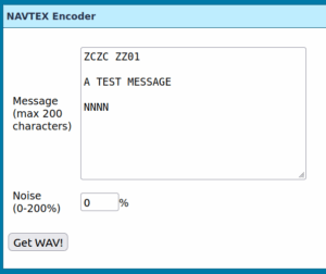 Frisnit.com bietet auf seiner Homepage einen webbasierten NAVTEX-Encoder an, mit dem man NAVTEX-Nachrichten in Audiosignale umwandeln und als Modulationssignal der Trägerfrequenz verwenden kann. Die Bandbreite des Audiosignals entspricht 2 kHz. Das Ausgabeformat des Audiosignals ist eine WAV-Datei. Wer möchte kann auch ein Rauschen als simulierte Empfangsstörungen hinzufügen.